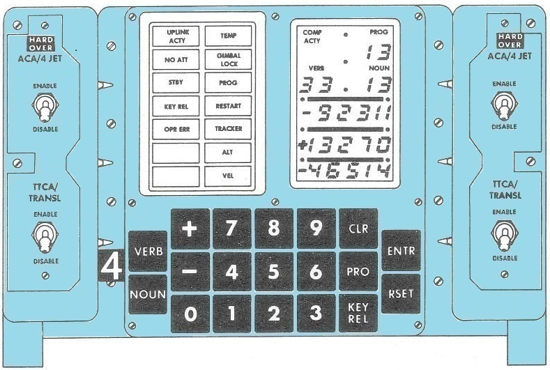 Keyboard pushbuttons - Enable astronauts to load shift register with necessary values (0 through 9) and signs (+and -) to be bus transferred to AEA. Pressing pushbuttons successively fills address and data indicators in order, from left to right. NOTE - If the CLR, ENTR, or READOUT pushbuttons are not fully depressed, either the OPR ERR light will illuminate or the DEDA will not operate.
